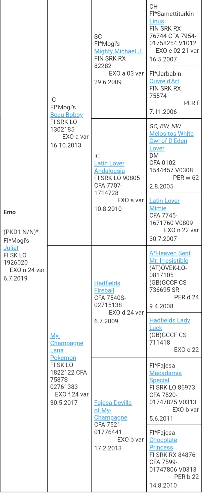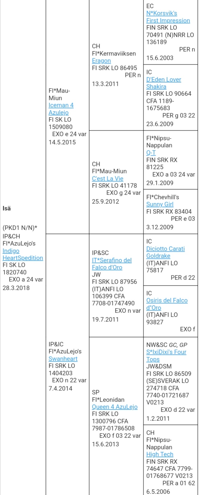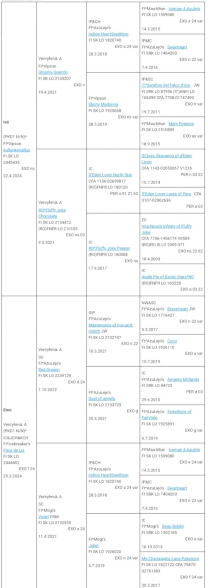I wish both kittens continue lifelong breeding work of Mogi's lines from breeder Marja-Leena Niemi, who has bred many BIS-winners and can no longer breed. I wish to see pedigrees to continue her lines to make good quality exotic-breeding and bring healthiness to lines. Please contact me e-mail: maria.hautala@fimnet.fi, if you are interested in breeding/show cat.